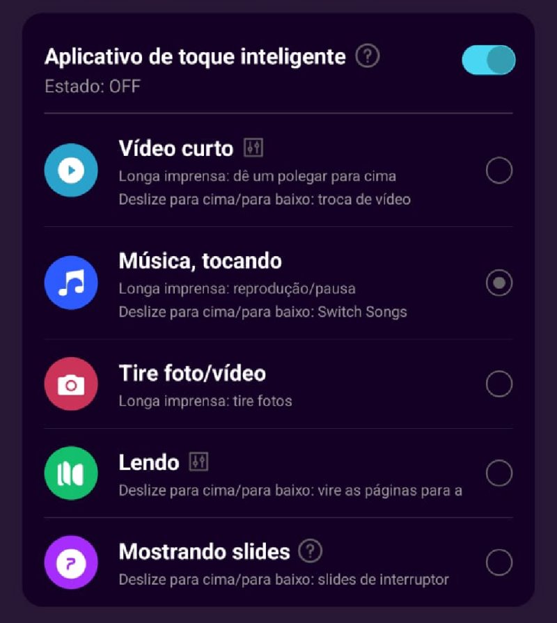 No aplicativo é possível escolher qual função esse toque executará no celular. É possível habilitar para:
