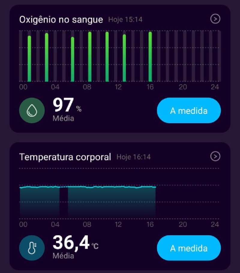 A medição de oxigênio no sangue e temperatura corporal são atualizados em um intervalo fixo pelo próprio aplicativo, sendo o oxigênio medido em torno de uma medição por hora e a temperatura corporal parece atualizar em conjunto com o batimento cardíaco.