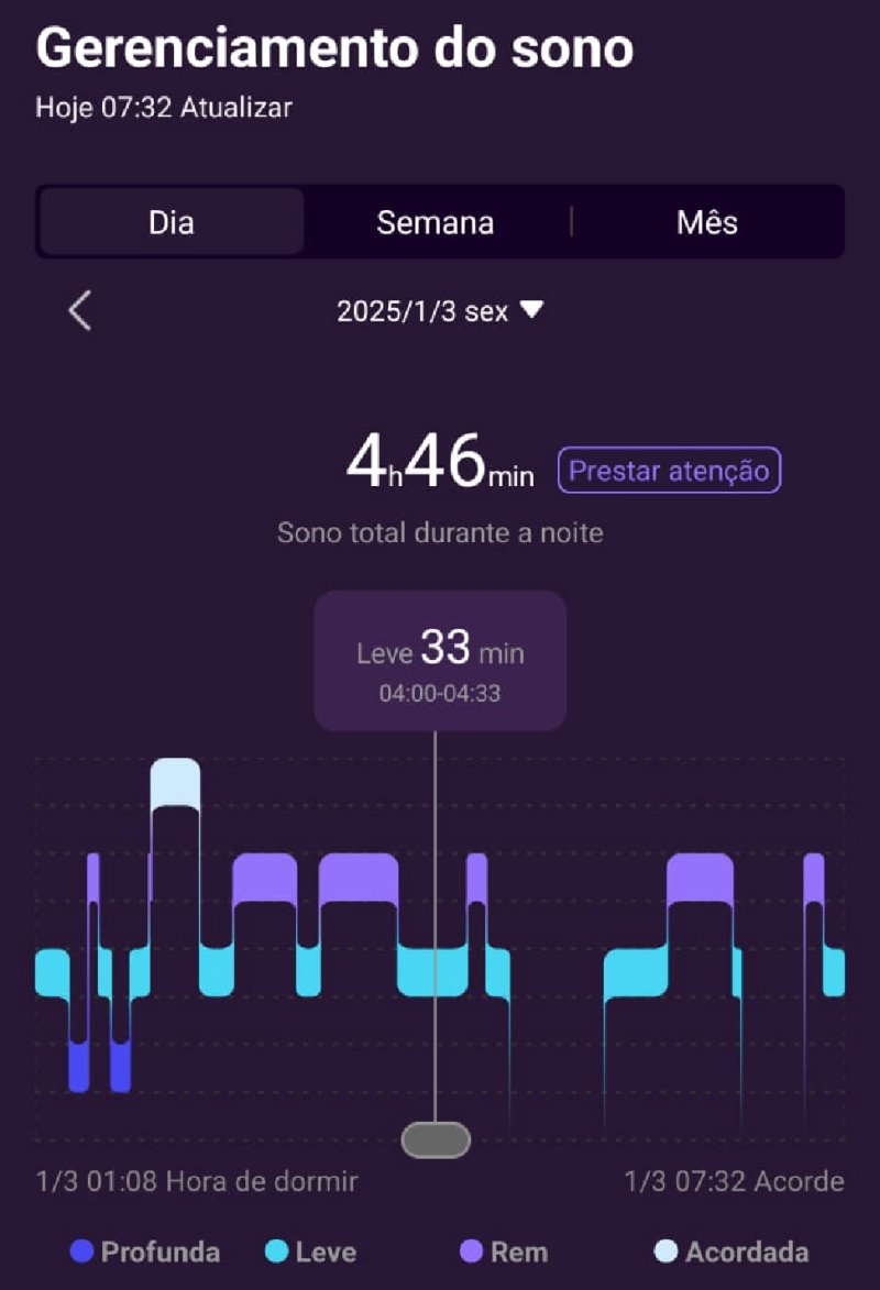 A medição de sono é algo interessante. Dos diversos dias que testei o anel inteligente Kumi evidenciou todas as vezes que estava acordado, até mesmo em momentos que não levantei da cama. Frequentemente preciso levantar no meio da noite para atender minha filha e aqui sempre bateram as ações da vida real com o relatório do anel.