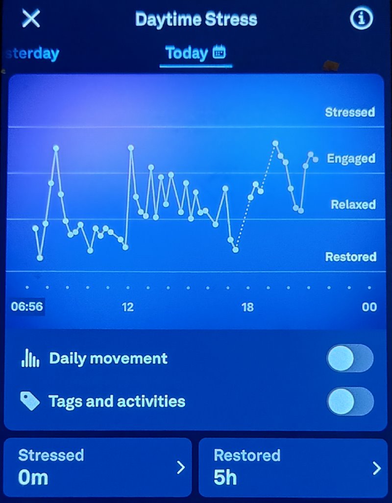 Somando todos os sensores e dados coletados o Oura também consegue estimar o grau de estresse que a pessoa está passando durante o dia e até mesmo plotar um gráfico de como foi seu estado durante o dia.