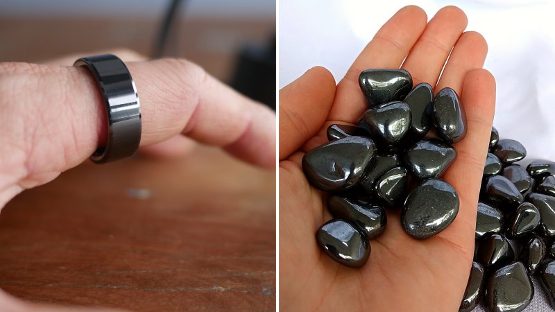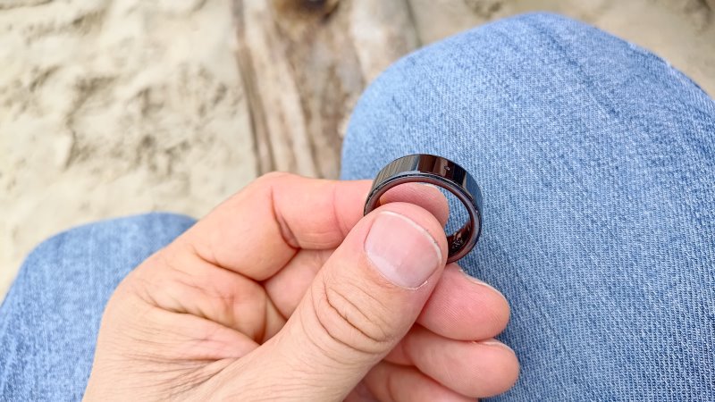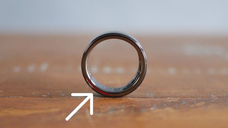 Há uma junção de materiais entre a camada superior e o resto do anel. Não há grande diferença no tom, mas muda de cerâmica para um aço inoxidável polido. Em um dos lados há uma marcação avermelhada para indicar a área sensível ao toque no anel.