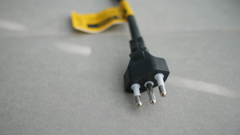 O cabo de alimentação sai abaixo dos seletores, e tem 160 centímetros de extensão. O plugue é dos mais grossos (20A) na versão 127V, na versão 220V deve ser o padrão comum.
