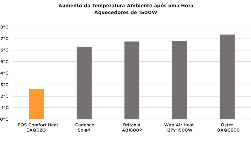 Utilizando o aquecedor na prática, suas maiores diferenças em relação a aquecedores a ar ficam bem notáveis. A primeira, é que demora mais para esquentar ambientes. Numa sala de 7,8 m², este EOS Comfort Heat foi capaz de aumentar a temperatura do ambiente em 2,6°C ao final de uma hora.