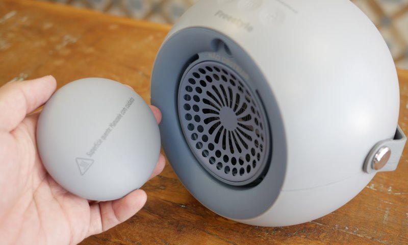 Seu design simpático é quase esférico. Possui 17cm de altura, 19cm de largura e 14cm de profundidade, realmente trazendo a ideia de algo compacto. A unidade tem duas cores principais, cinza no corpo e azul nas grades e bordas. É composto por dois encaixes de plástico no corpo principal e outros dois encaixes plásticos na entrada e na saída de ar. Nas laterais, pinos de plástico cromados prendem uma alça que parece ser de couro sintético.