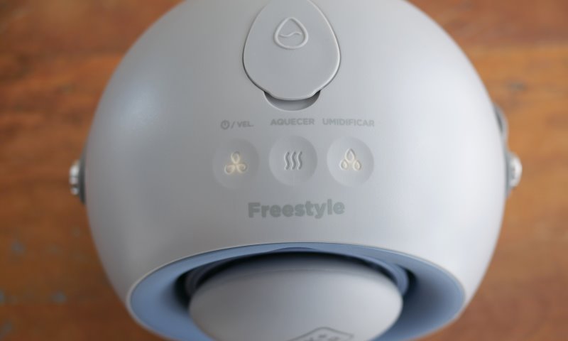 O painel aparece em cima, são três botões touch que ligam os modos ventilador, aquecedor e umidificador; cada um com baixo-relevo desenhando sua respectiva função, e uma serigrafia escura bem sutil acima. Os botões possuem LEDs na cor branca, que acendem ao acionar a função. O modo Ventilador possui duas velocidades, e ao ativar a máxima o LED muda de cor para azul.