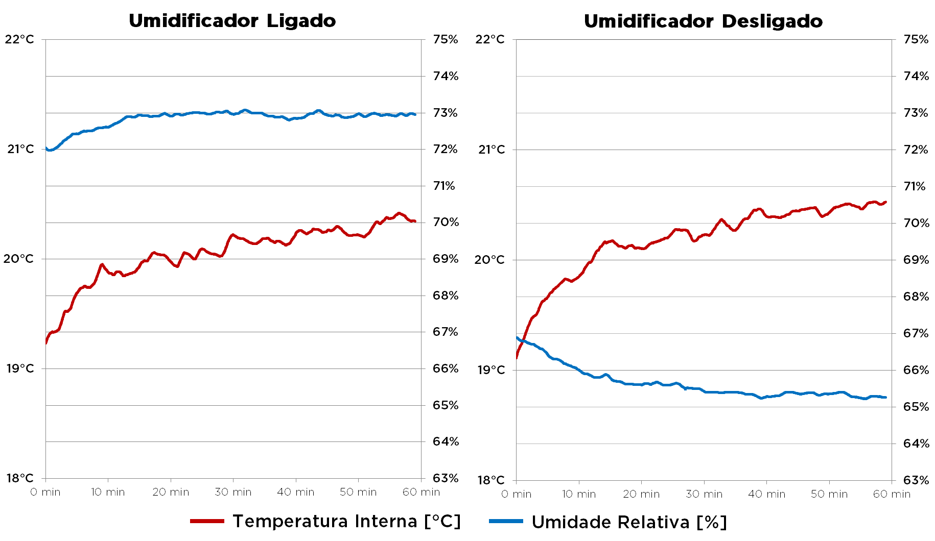 Essa é a sacada do AUP4: com o modo Umidificador ligado se fornece calor e água para o ambiente. Assim é possível manter a umidade relativa do ar mais estável enquanto também se sobe a temperatura, diminuindo a sensação de ar seco. Algo que pode-se notar no gráfico.