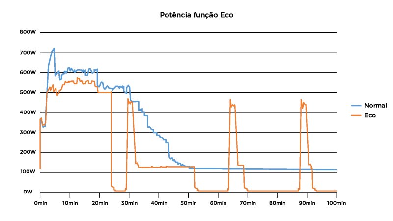 Mostra o consumo em kWh no visor, a resolução e menor valor mostrado é de 0,1 kWh. Reinicia o registro a cada vez que liga o produto. Em nossos testes, a função se manteve próxima do resultado real, mas a precisão cai na primeira hora, provavelmente pelo inversor de frequência alterar a potência com certa regularidade, o que deixa o registro instável.