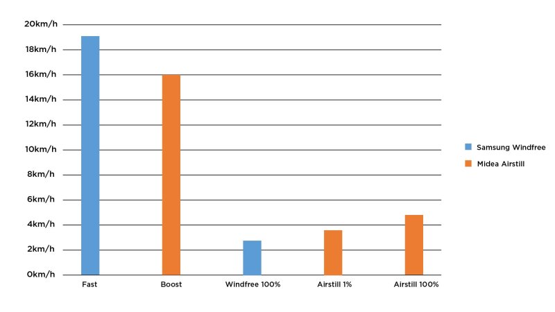 A velocidade de vento consegue ser ainda mais baixa que o Midea Airstill na função “Breeze Away” na velocidade menor. É inesperado que o Samsung saia na frente, pois o Midea consegue ter um controle maior de velocidade de vento, indo de “1% a 100%”, enquanto que o ar condicionado da Samsung funciona com base em velocidades já predeterminadas.