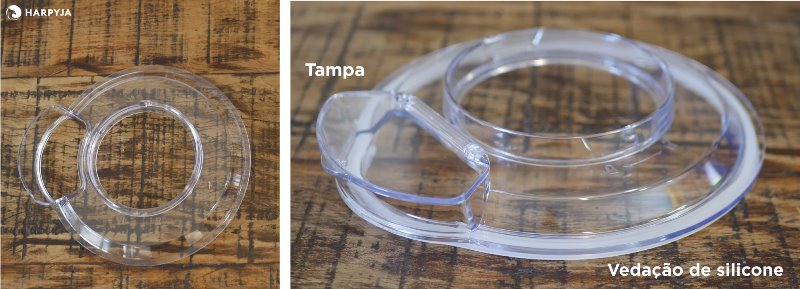 A mudança na tampa impacta na contenção dos alimentos: foi colocado uma borracha de silicone e acrescentado uma porta no alimentador para poder isolar a área completamente. Na imagem abaixo a tampa da esquerda é de 2019 e a da direita é de 2020.