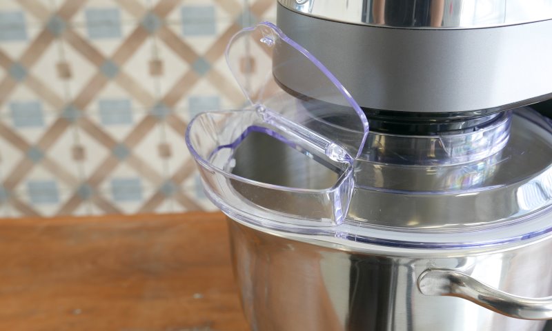 Também acompanha um aparador feito em plástico transparente, que fica preso na cabeça da batedeira e sobe com ela. Isso traz uma melhora na usabilidade quando tendo que remover ou colocar os batedores ou a tigela, já que o aparador não fica no caminho como na maioria dos modelos. O acessório também possui um anel de borracha ao redor que ajuda na vedação com a tigela, e funciona bem quando combinado com a baixa velocidade mínima.