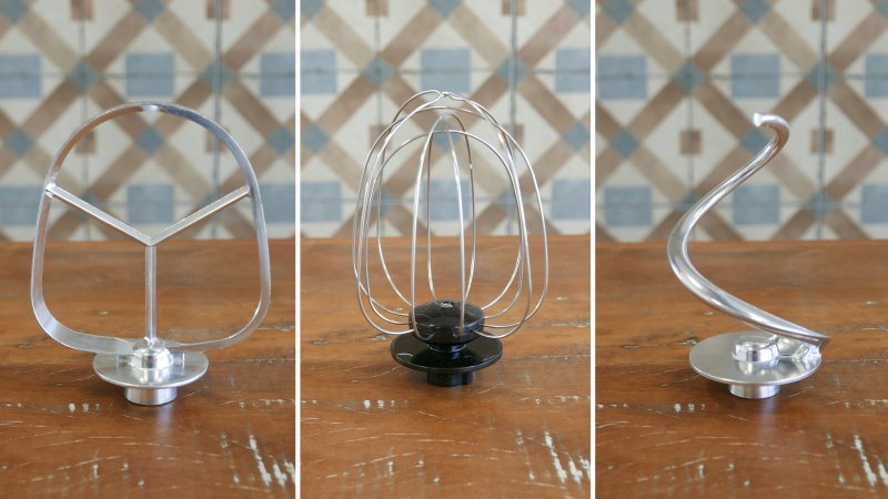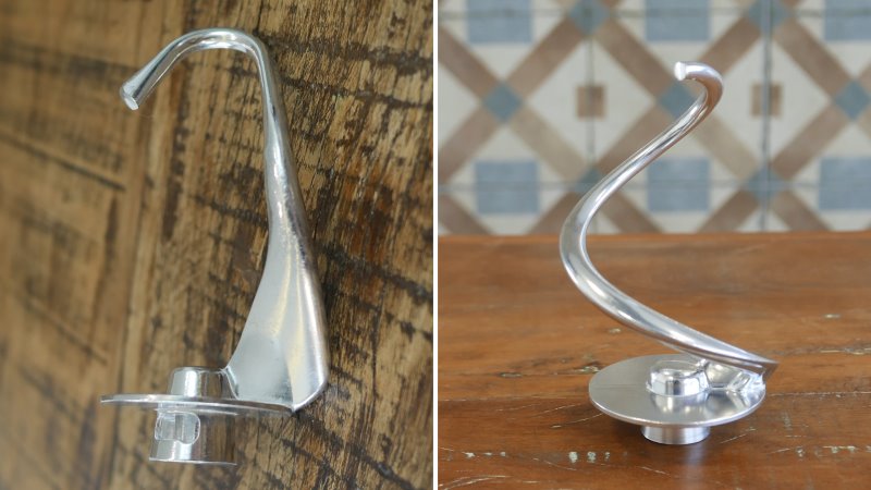 Tem também os batedores de massas médias e pesadas, aqui ambos são feitos em metal (aparentemente zamak, uma liga metálica) com acabamento polido. A raquete continua igual ao modelo anterior, é bem simples, sem muitos diferenciais; porém o gancho sofreu uma boa mudança de desenho, e agora tem um design mais similar ao de outras batedeiras com formato mais espiral ao invés do gancho de modelos antigos.