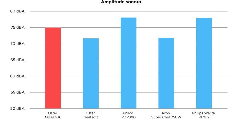 Quanto à amplitude sonora ela não se destaca muito, ficando próximo da média de outras batedeiras que já testamos no passado. São cerca de 75 dBA de amplitude média.