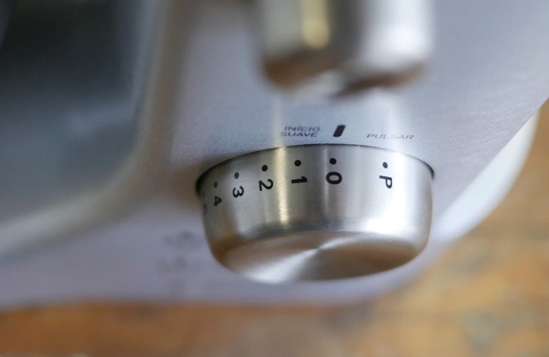 O seletor de velocidade é muito agradável de utilizar. É suave para rotacionar. Por sinal, no seletor é possível girar a peça no sentido anti-horário e pulsar os batedores. É uma forma de ir rapidamente para a velocidade máxima, pois todo o funcionamento da batedeira é com aceleração lenta.
