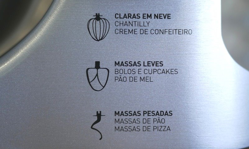A batedeira planetária PBP1200 chama a atenção com grande parte do corpo em alumínio escovado. A textura é visualmente agradável e elegante. Há também várias peças em aço inoxidável como o seletor de velocidade, o botão para levantar a cabeça, o encaixe da tigela e a faixa estética na cabeça. O inox gera um leve contraste com o bloco de alumínio por ser um metal mais amarelado, mas assim mesmo a diferença entre os metais agradou.