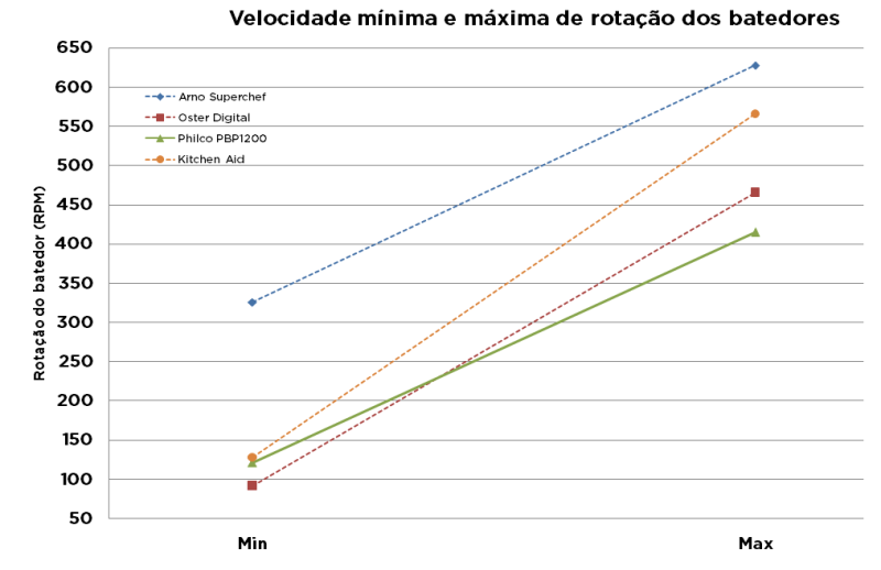 A Philco PBP1200 tem uma ótima variação de velocidade, com um seletor contínuo, acelerando ou desacelerando com precisão muito além das 10 marcações presentes no seletor! A rotação mínima é de 121 rotações por minuto, muito parecida com a velocidade de partida da KitchenAid Artisan. O gráfico abaixo mostra a variação de velocidade da mínima para a máxima da KitchenAid Artisan, Philco PBP1200, e Arno SuperChef (batedeira planetária mais simples).