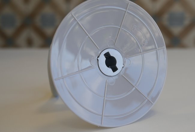 A tigela é lisa, sem grandes detalhes estéticos, mas tem o ressalto central, e possui uma curvatura agradável. Sobre ela encaixa um aparador com boca para alimentar ingredientes. São duas peças de acrílico, com ótimo encaixe entre elas. Apesar de bem desenhadas, são peças que poderiam ser mais espessas, pois são mais frágeis. Uma queda aqui pode quebrar o aparador.