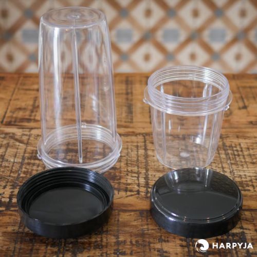 O conjunto vem com várias peças. Fora o corpo, acompanha um jogo de lâminas removíveis, dois copos e três tampas, sendo uma com bico. Os copos são de tamanhos diferentes. O maior tem volume útil para 1 litro de líquido e o pequeno tem volume total de 715 ml, mas um volume útil de 400ml. Apesar de tamanhos diferentes, as bocas dos copos são do mesmo tamanho então qualquer tampa cabe em qualquer um. Ambos copos são de Tritan, ou seja, são plásticos transparentes super robustos. Não quebram mesmo que arremessados contra a parede. Só faltou colocarem uma marcação no copo, pois é algo útil e mais ainda quando preparando algo em um copo individual.