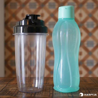 Uma característica de muitos liquidificadores pessoais é a portabilidade do produto e nesse quesito o Mallory não consegue entregar. Por ter um motor grande e pesado pode produzir alimentos para serem transportados usando copo com bico, mas a unidade é para ficar fixa em uma bancada. O copo também não é muito prático para carregar por ter 1 litro de volume e ser grosso, mas não é algo absurdo. Há garrafas de água portáteis com tamanho similar (garrafa abaixo é um tupperware de 1 litro). Apesar de não ser portátil, a praticidade do encaixe é ótima, as roscas são boas, o bico da jarra é prático.