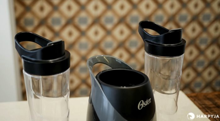 Acompanhado do corpo, o Oster MyBlend vem com dois copos, duas tampas com bico e uma tampa com lâminas para o corte. É um conjunto completo para duas pessoas terem suas bebidas independentes. Os copos são de plástico flexível, mas inquebrável (Tritan). Pode arremessar contra a parede que nada vai acontecer com o copo em si. Isso é bem importante, pois os copos são bem compridos e com diâmetro pequeno. Qualquer encostada neles quando em pé tombam facilmente.