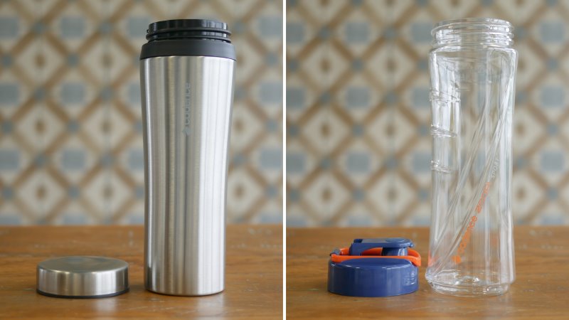 O material das jarras é superior. A squeeze é de Tritan, material flexível e resistente, enquanto que a jarra metálica e sua tampa são de inox, com capacidade térmica.