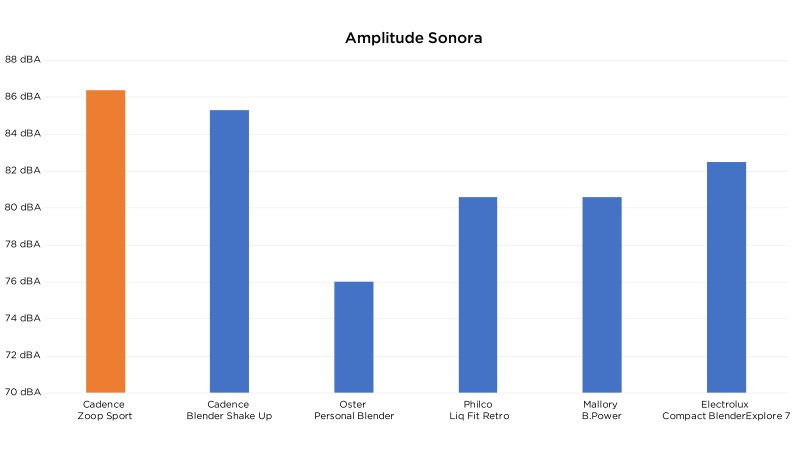 Estampado na caixa do produto, o INMETRO classifica o ruído do Zoop Sport com 95 dBA, e não é sem motivo. Aqui na Harpyja percebemos que o ruído deste liquidificador pessoal é bem alto, em praticamente qualquer situação medida. Observamos uma média de 85 dBA, que o coloca como liquidificador pessoal mais barulhento que avaliamos.