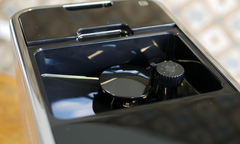A tampa central é onde ficam os grãos de café. É uma peça fácil de abrir e é uma área espaçosa para abastecer. A tampa possui uma borracha ao redor para manter o café isolado da umidade externa com o intuito de evitar a perda de qualidade dos grãos. Mesmo que venha a derramar água no topo da máquina o café continuará seco ali dentro.