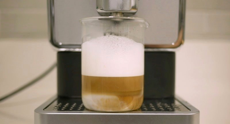 Ao passar o Latte a máquina começa puxando o leite. Para fazer a passagem a máquina gera vapor e com isso traz junto uma pequena dose de água. Aqui a temperatura é bem alta, perto de 95°C. Quando misturando com o leite a temperatura cai, mas ainda sim o leite aquece acima dos 70°C. A mistura completa acaba entregando o Latte em torno de 70 e poucos graus Celsius.