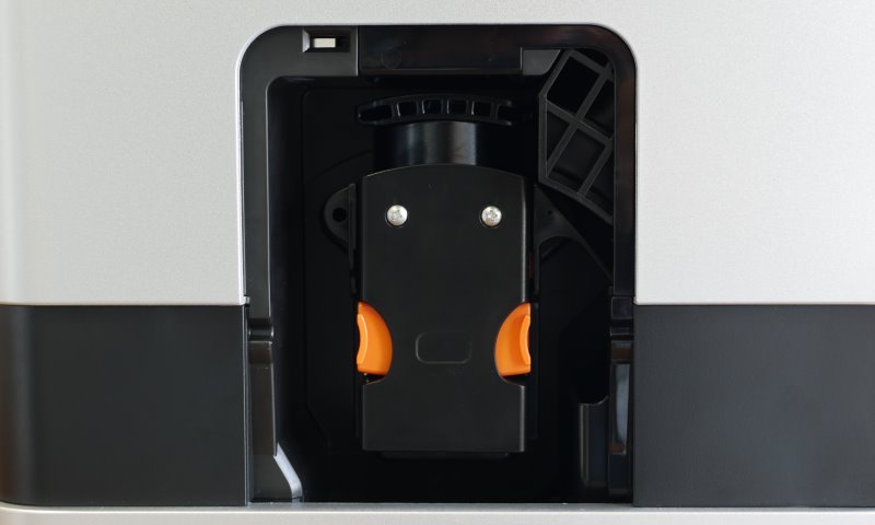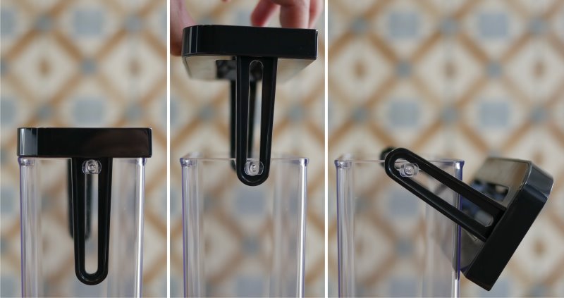 A tampa é também a alça do compartimento. É uma ideia inteligente, pois além de prático para carregar, não precisa assentar a tampa em lugar algum quando abastecendo ou transportando. Por sinal, é possível abastecer sem precisar tirar o reservatório. A tampa tomba para trás o bastante para servir o compartimento com água.