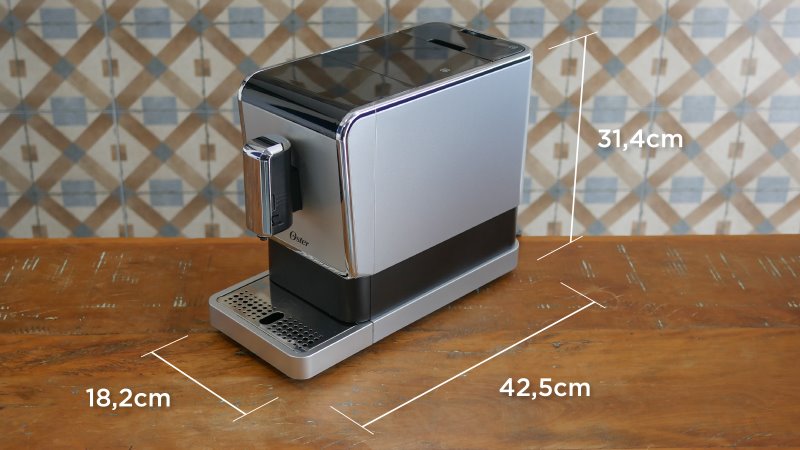 Considerando a quantidade de tarefas que a cafeteira faz, é um produto compacto. Sua altura chega a ser abaixo de muitas cafeteiras simples no mercado. Tem pouco mais de 31 centímetros de altura, 18 cm de largura e 42,5 de profundidade. A intenção é ficar fixo na bancada, pois é uma unidade pesada (quase 8 quilos). É possível deixar o produto colado em uma parede ou outro eletrodoméstico no lado direito, pois não há nada que precise de acesso por esse lado. Além disso o cabo de alimentação sai por trás em 90° então é possível praticamente colar a unidade no fundo da bancada.
