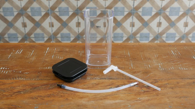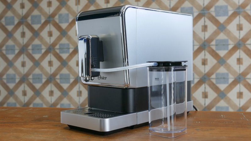 Junto com esta cafeteira Oster acompanha um reservatório de leite. É uma peça em plástico transparente com uma tampa plástica preta. Bem feita e visualmente atraente. Há um conjunto hidráulico para que seja possível fazer a sucção do leite do reservatório injetá-lo no bico da máquina para dosar junto com o café. São quatro peças, algumas plásticas, outras de silicone e o encaixe principal; feito por um bico metálico que encaixa facilmente através de imã na cafeteira.