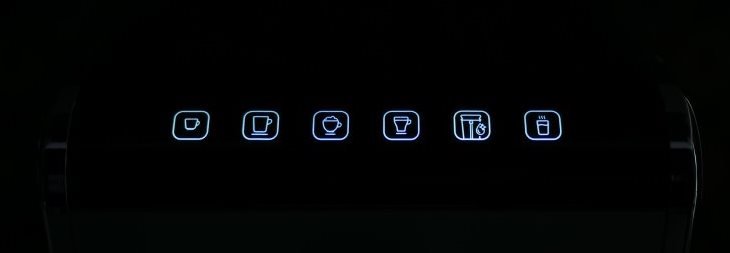 Os botões são todos por toque, não há saliência no painel, então dificulta para deficientes visuais. Na área superior ainda há outros ícones, porém esses são para solicitar ações e normalmente ficam apagados. O display é aceso quando falta grãos ou água nos compartimentos, para que seja feito o descarte das borras de café, ou fazer a descalcificação do sistema de aquecimento. Os ícones seguem o mesmo padrão do painel de ação, mas aqui ao invés de LEDs brancos são em LEDs alaranjados. São imagens intuitivas, provavelmente a maioria das pessoas irá reconhecer o que está se solicitando sem mesmo abrir o manual.