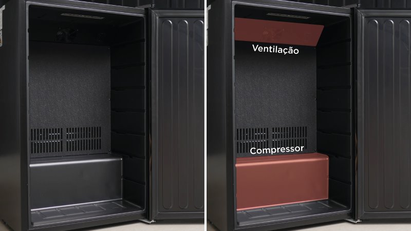 Dos 100 litros de capacidade interna declarados, temos 85 litros úteis. A cavidade totaliza 73,3 centímetros de altura, 42 de largura e em grande parte apresenta 30,7 centímetros de profundidade. Na parte inferior são em torno de 18 centímetros de altura com uma profundidade menor, devido ao compressor na área externa. No topo há uma perda no fundo para a acomodação do sistema de ventilação que fica em ângulo.