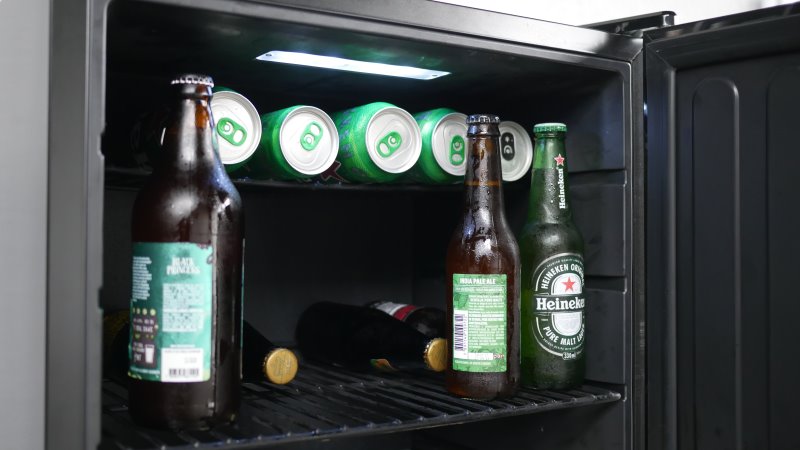 Apesar da frente ser toda de vidro, há transparência em somente um pequeno pedaço do vidro. Não há tanta visão do que há dentro da unidade. Em termos de design pode ser interessante, mas não é algo muito útil para reconhecer como está o estoque interno.