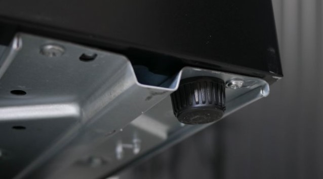 A unidade possui 4 pés niveladores que auxiliam a dar estabilidade, independente do desnível do piso. São peças com rosca metálica e podem erguer a unidade em até pouco mais de 1 centímetro.