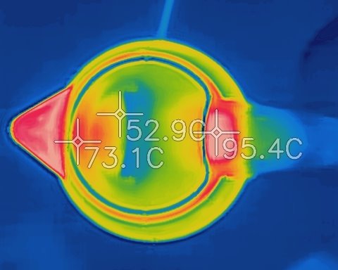 Respeitando o limite máximo de volume a chaleira não transborda. Passando desse nível é possível espirrar água para fora do bico. O corpo do produto não isola a temperatura interna, ou seja, durante o funcionamento a Lenoxx atinge quase 100 graus no exterior. A tampa atinge temperaturas altas, ficando perto de 70 graus no botão para abrir a chaleira. É quente, mas dá para abrir. A imagem abaixo mostra a distribuição de calor no topo da unidade.