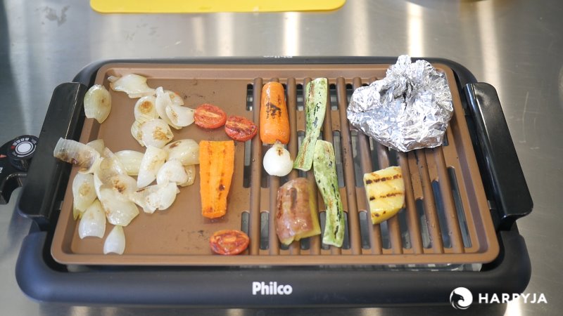 Com os legumes fizemos uma trouxinha com alguns e outros jogamos direto na chapa. Testamos em temperatura baixa e em temperatura alta. O resultado foi positivo, mas ter um controle um pouco maior seria melhor, independente de usar na temperatura mínima ou máxima.