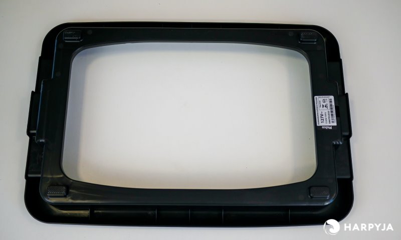 A base é inteira plástica, somente com um encaixe metálico. Há quatro pés plásticos com leves ranhuras para dar mais aderência, mesmo não tendo borracha.