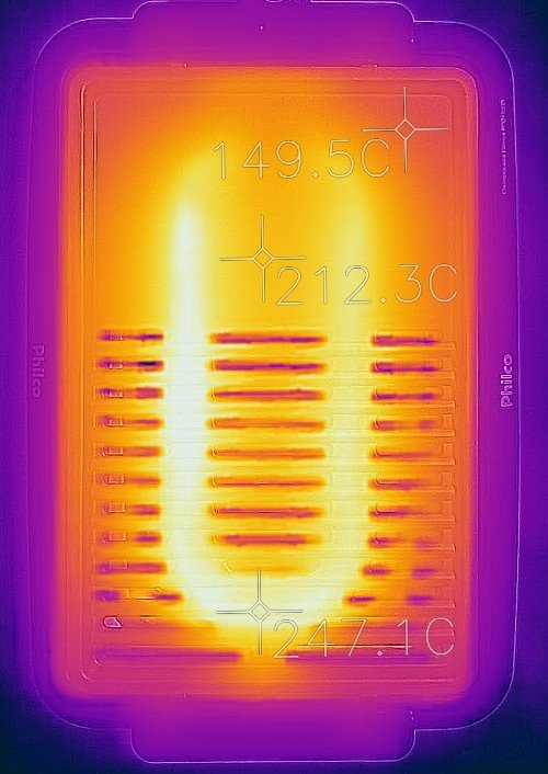 A resistência deste Philco dá conta de aquecer, mesmo com a grelha bem carregada de carnes. Nos testes em vazio a área da resistência em si chega a bater 250°C e assim que se distancia dela a temperatura cai.