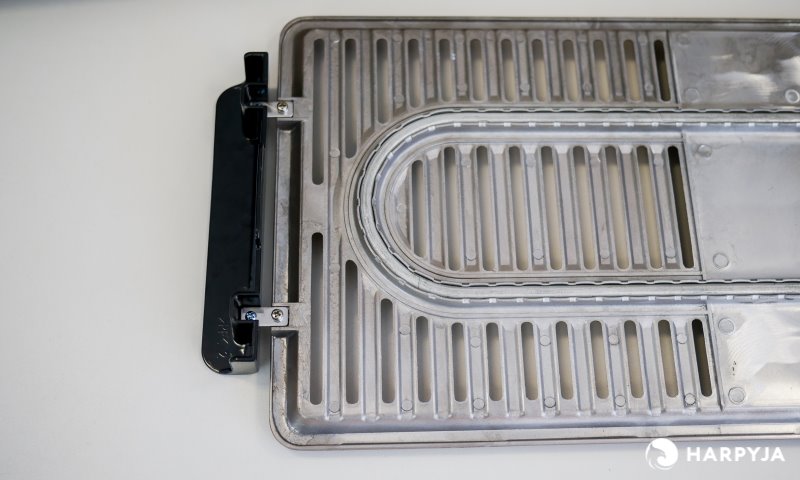 A união da resistência com a chapa traz algumas vantagens. Uma delas é evitar que gordura pingue sobre a resistência e gere fumaça. Além disso, facilita a limpeza do conjunto, podendo tirar tudo de uma vez e limpar como uma peça só.