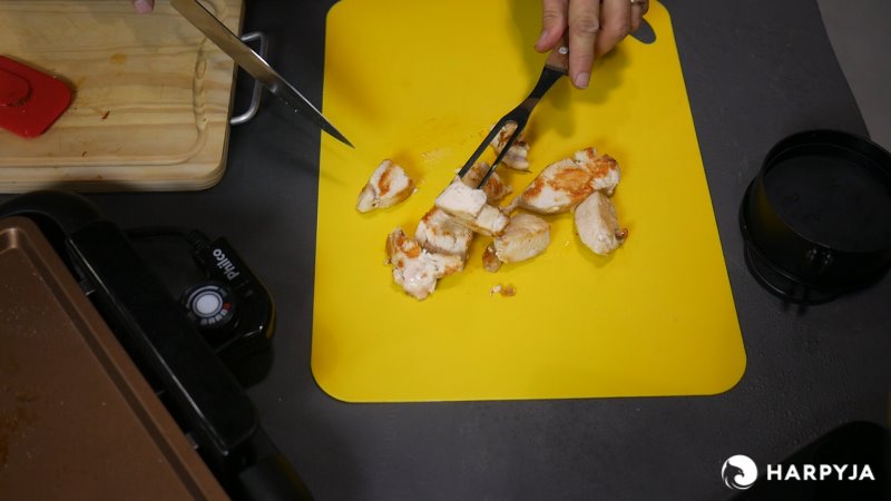 O peito de frango é uma peça mais grossa e com isso douramos ao redor dele e depois de 15 minutos no fogo fatiamos em pedaços menores para acelerar o processo. O sabor entregue foi satisfatório e também ficou com uma textura agradável interna e externa.