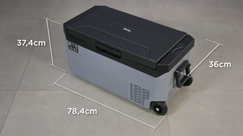 Apesar do tamanho externo ser até maior que um cooler da Rubbermaid de 45 Litros, o volume interno fica pouco acima de 35 Litros devido a necessidade de espaço para os componentes de resfriamento deste EOS.