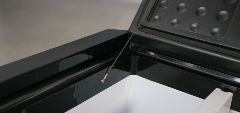 Há um cabo de aço revestido com plástico para segurar a tampa, impedindo ela de abrir mais que 130°. Esse cabo poderia estar posicionado melhor e a fixação dele também seria melhor se fosse algo de qualidade superior. Aqui são somente dois parafusos segurando o cabo.