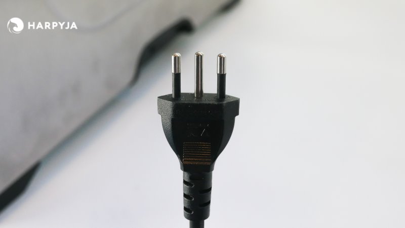O cabo de força possui 100 cm de comprimento e sai da parte traseira do produto, aparenta ser de boa qualidade.