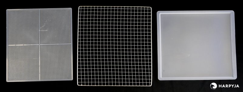 Na parte interna o desidratador acompanha 7 grades também em inox com cerca de 0,1 m² cada. Apesar da qualidade do material e estrutura ser boa, o acabamento das peças possui imperfeições: algumas vieram um pouco tortas e com algumas com rebarbas afiadas nas soldas entre a grade e a estrutura da mesma. Além disso o produto vem com 6 bandejas plásticas para alimentos moídos e uma grade em plástico com pequenos furos para alimentos pequenos.