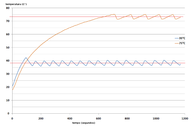 Quando trabalhando na temperatura mais baixa é o onde o Frugal teve o maior erro, em torno de 4°C acima da temperatura programada. O produto é muito preciso quando usando em temperaturas mais altas, ficando com somente 1°C de erro em 75°C.