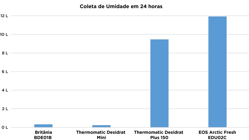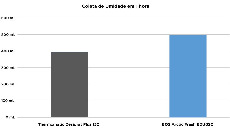 Esse desumidificador consegue coletar até 500 mL de água do ambiente a cada hora. É o desumidificador mais eficaz que testamos até agora, apresentando um aumento de 30% em relação ao Desidrat 150. O teste foi feito em condições constantes de alta umidade, então o resultado no dia a dia pode ser menor. Ainda assim, é um resultado considerável.