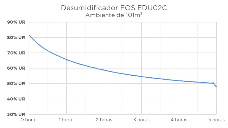 Posicionando o desumidificador da EOS numa sala grande de 36 m² (e 101 m³) com umidade a 80%, não demora muito para ele já conseguir baixar a umidade. Em pouco mais de 30 minutos a umidade cai para 70%, e com 1 hora e 46 minutos já atinge 60%.