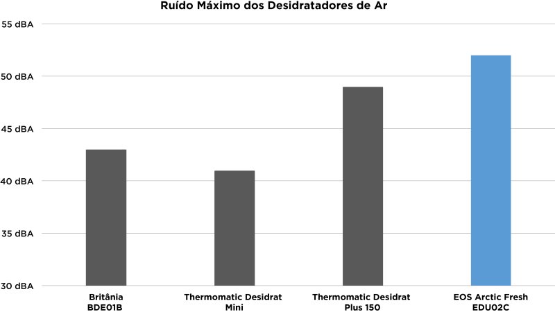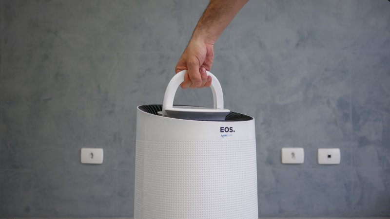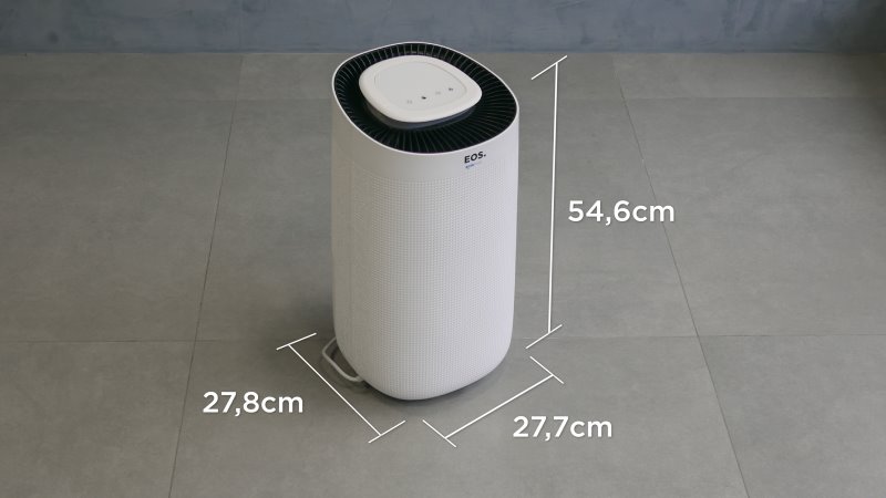 Em questão de ruído, o desumidificador de ar da EOS registra por volta de 51 dBA. O equivalente a uma air fryer bem silenciosa.