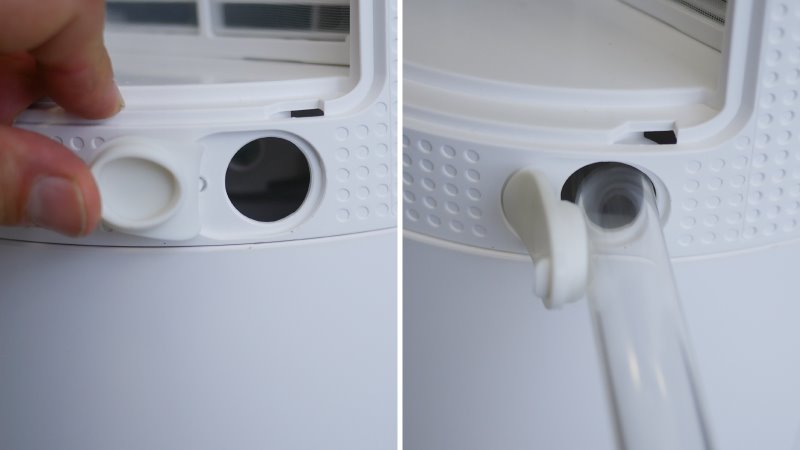 Se o funcionamento for contínuo, você pode preferir encaixar o dreno. Essa mangueira é conectada numa abertura tampada por silicone, acima do reservatório. Basta abrir a tampa e enfiar qualquer lado da mangueira pela abertura. Lá dentro há um pequeno bico que irá ficar dentro da mangueira.