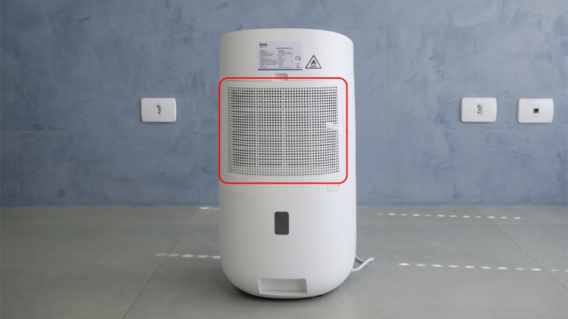 Na parte traseira, há uma tampa com furos no mesmo padrão dos rebaixo arredondados, ornando perfeitamente com o conjunto. É por ali que o ar entra para ter sua umidade removida.